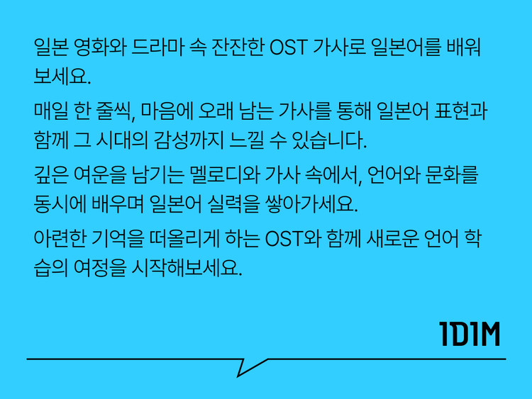 일본 영화와 드라마 속 잔잔한 OST 가사로 일본어를 배워보세요. 매일 한 줄씩, 마음에 오래 남는 가사를 통해 일본어 표현과 함께 그 시대의 감성까지 느낄 수 있습니다.